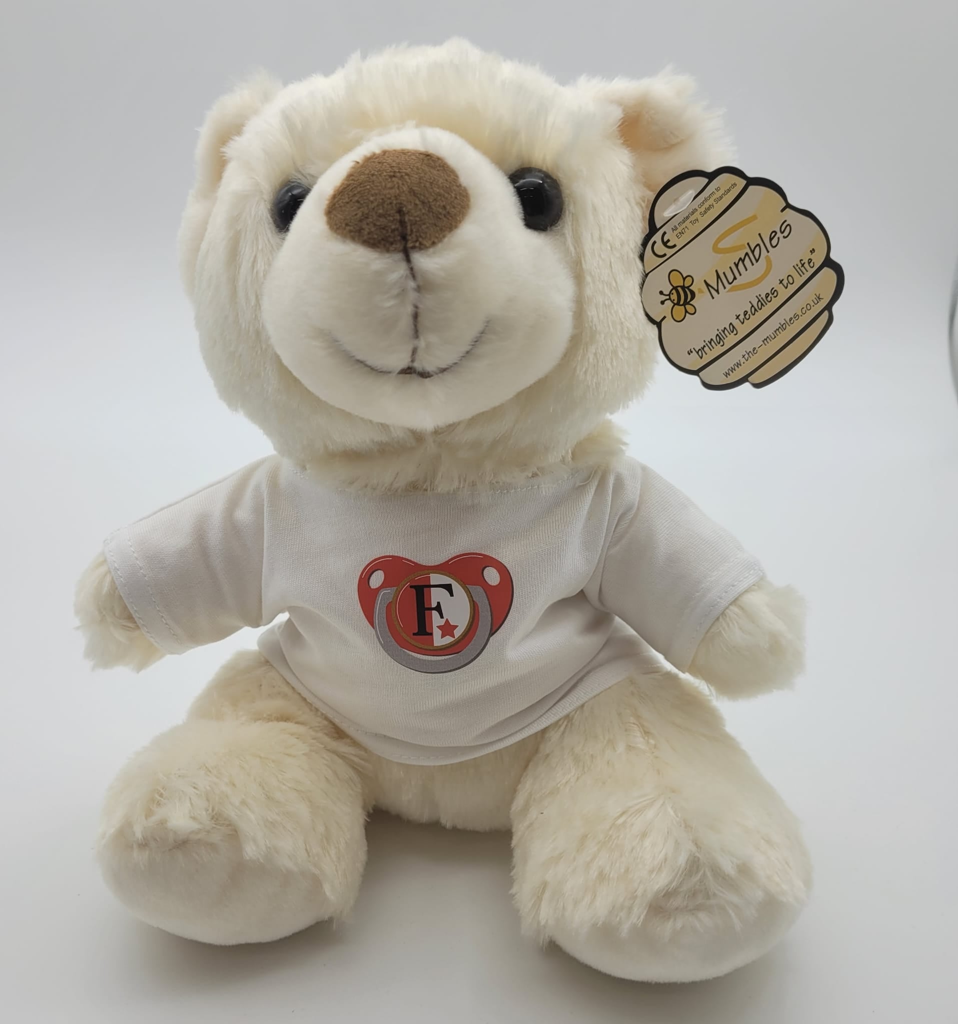Pluche, crèmekleurige of bruine beer gekleed in een verwijderbaar wit katoenen t-shirt.